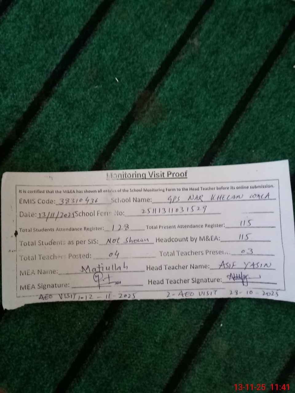 | Attendance Register | Head Teacher | MEA with School | Visit Proof |