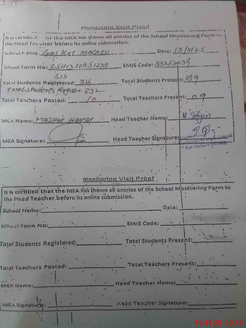 | Attendance Register | Head Teacher | MEA with School | Visit Proof |