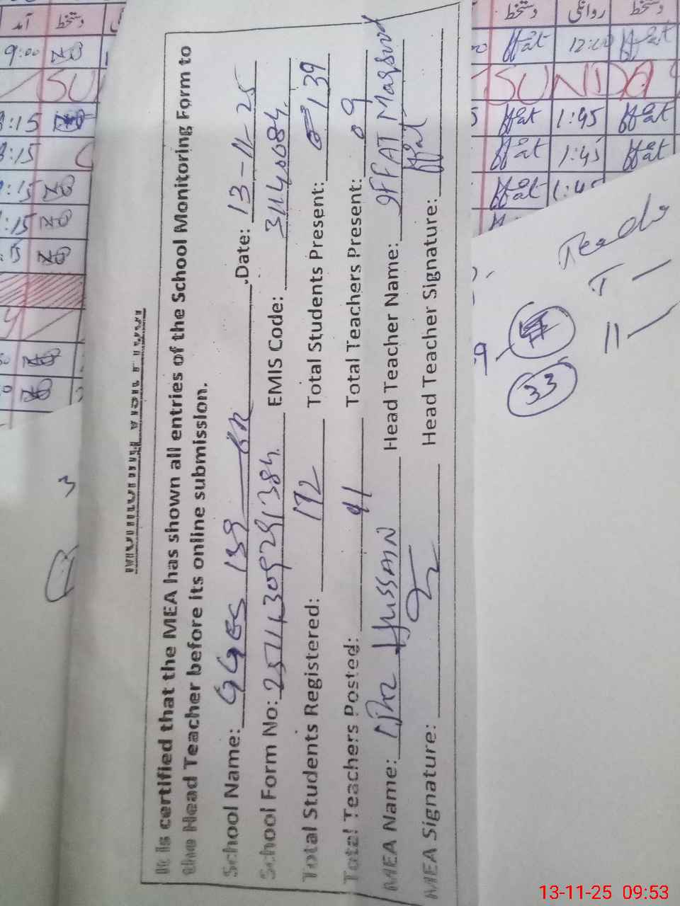 | Attendance Register | Head Teacher | MEA with School | Visit Proof |