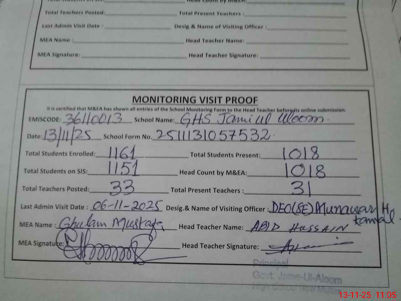 | EMIS Code: 36110013 | Name of School: GHS JAMIA-UL-ALOOM NEAR TELEPHONE EXCHANGE NEW MULTAN | |||