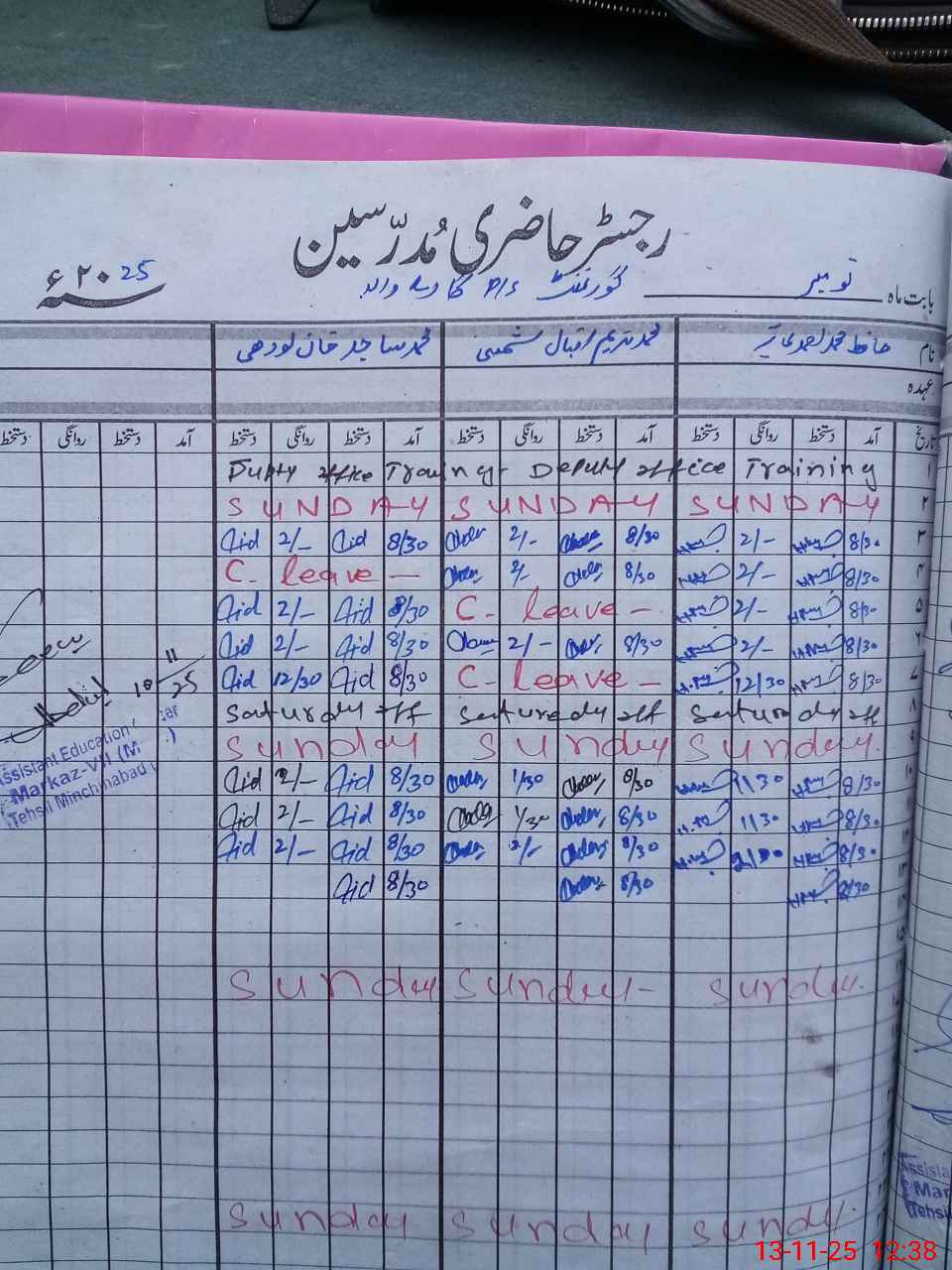 | CNIC | Full Name | Designation | R/C | Absence During Last Calender Month |