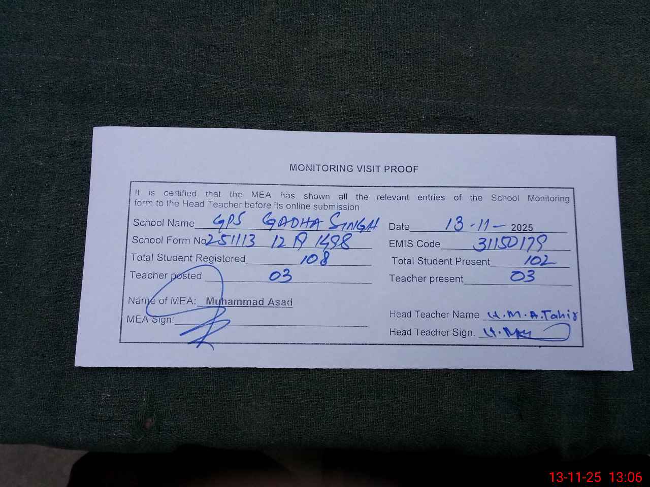 | Attendance Register | Head Teacher | MEA with School | Visit Proof |