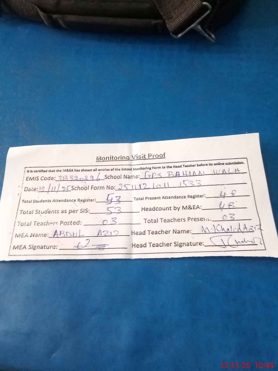 | Attendance Register | Head Teacher | MEA with School | Visit Proof |