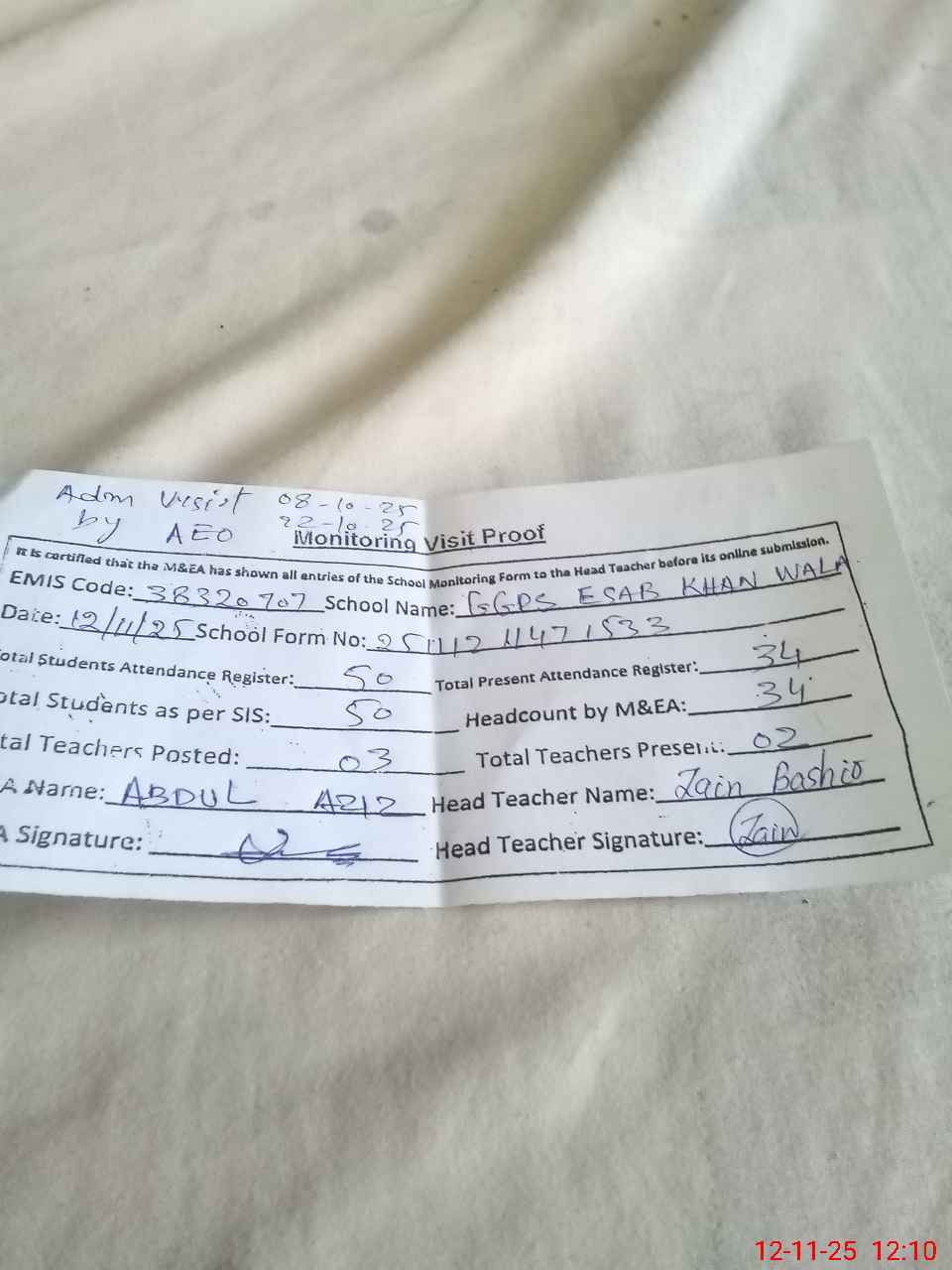 | EMIS Code: 38320707 | Name of School: GGPS ESAB KHAN WALA | |||