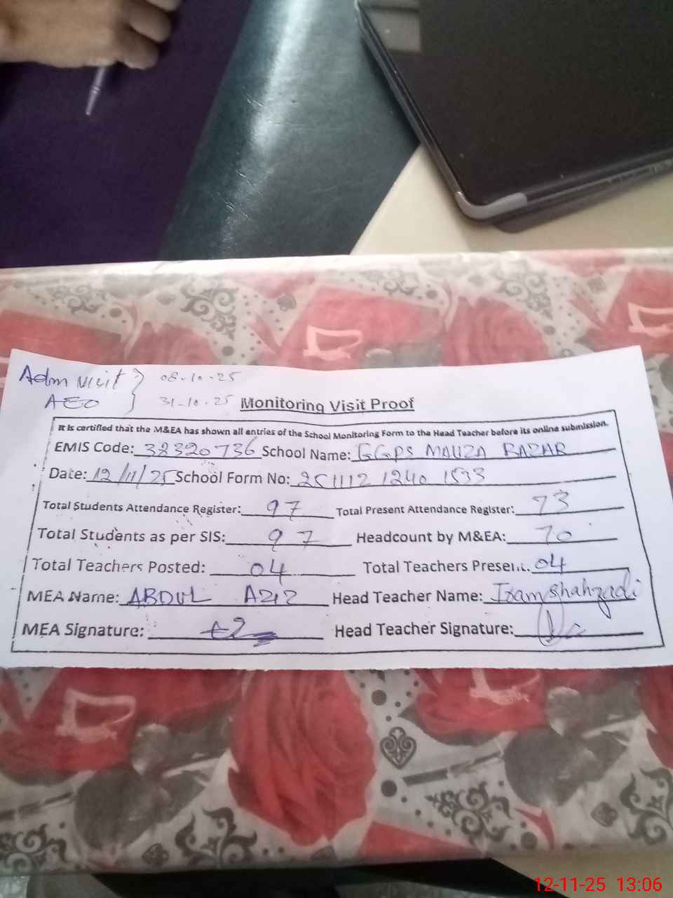 | Attendance Register | Head Teacher | MEA with School | Visit Proof |