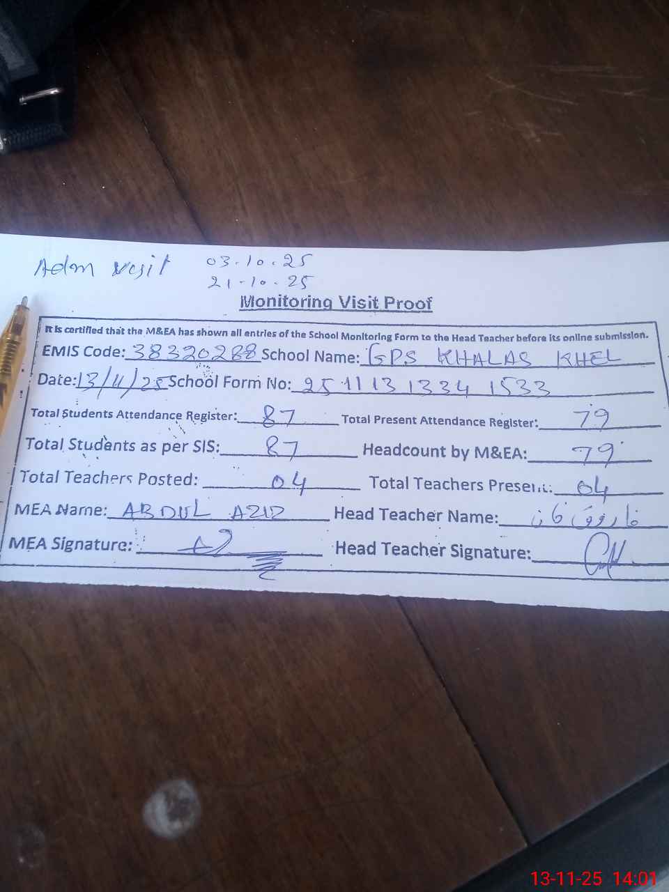 | Attendance Register | Head Teacher | MEA with School | Visit Proof |