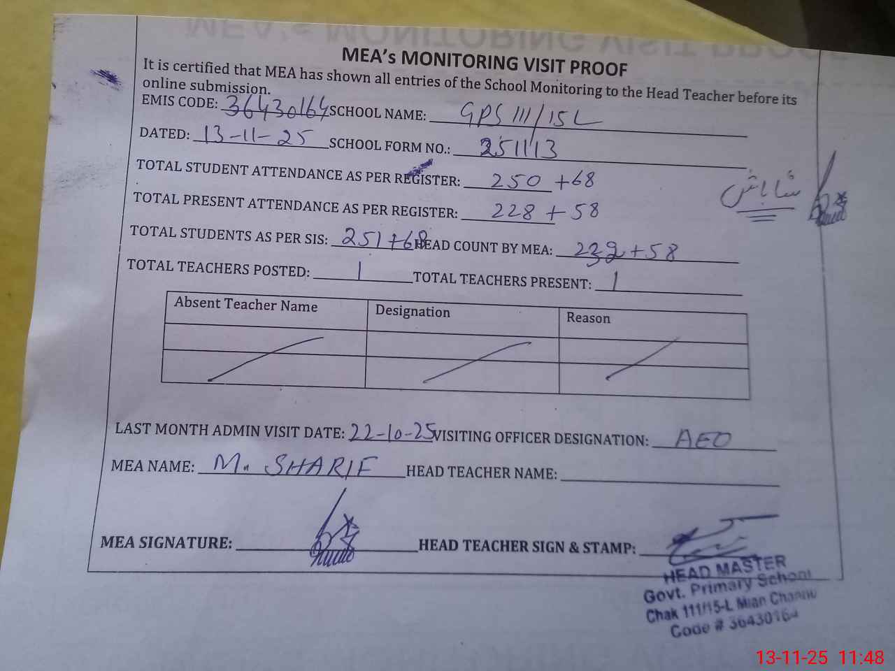 | EMIS Code: 36430164 | Name of School: GPS 111/15-L, P/O KOT SINGH, MIAN CHANNU | |||