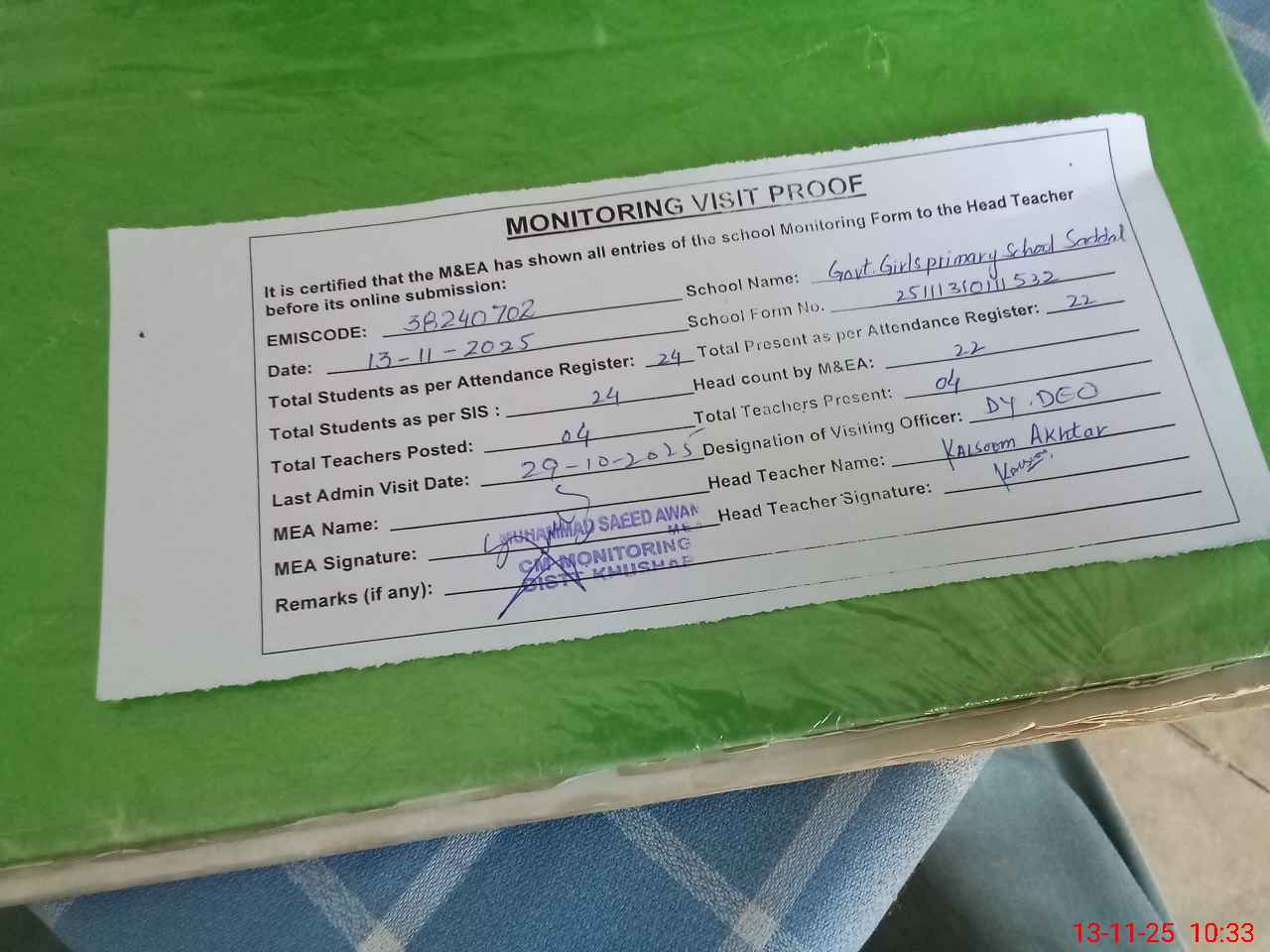 | Remarks (Use Separate Page if Required): Students on SIS QTY 24 Last admin visit On 29 October 2025 by DY DEO | |||||
