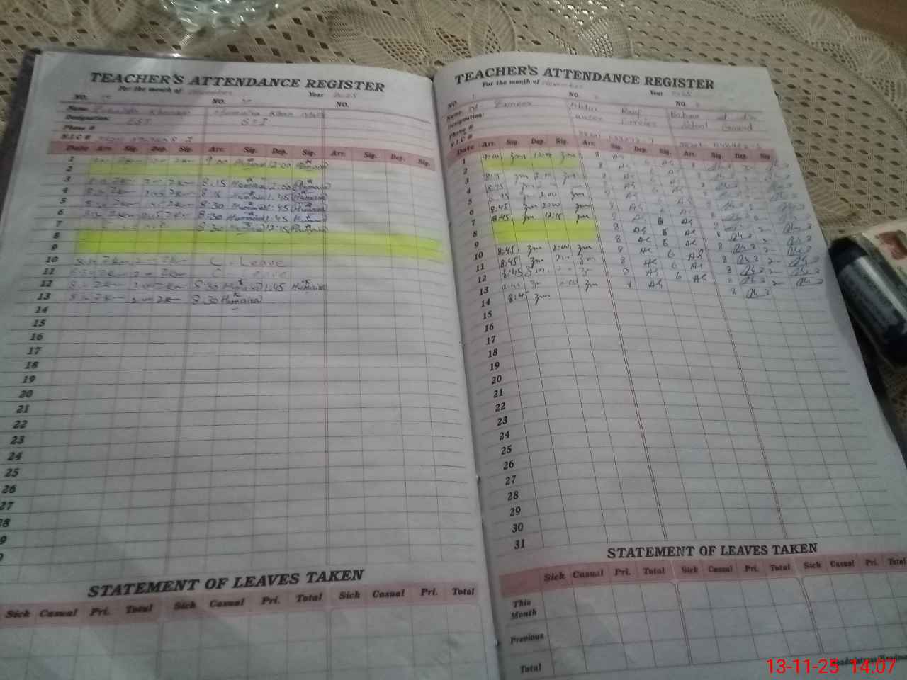 | CNIC | Full Name | Designation | R/C | Absence During Last Calender Month |