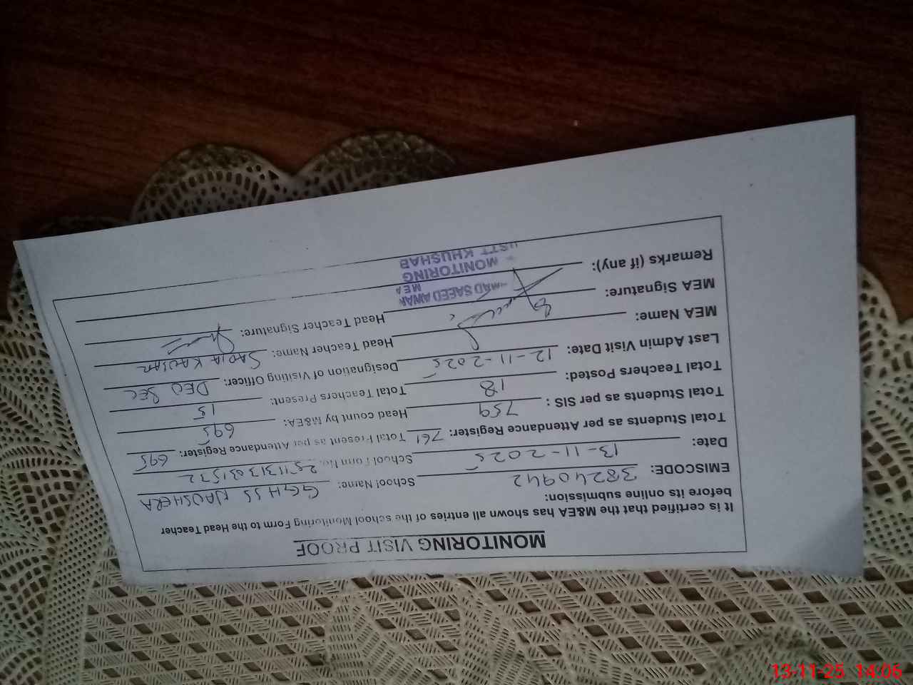 | Remarks (Use Separate Page if Required): Students on SIS QTY 759 Last admin visit On 12 November 2025 by DEO SE | |||||