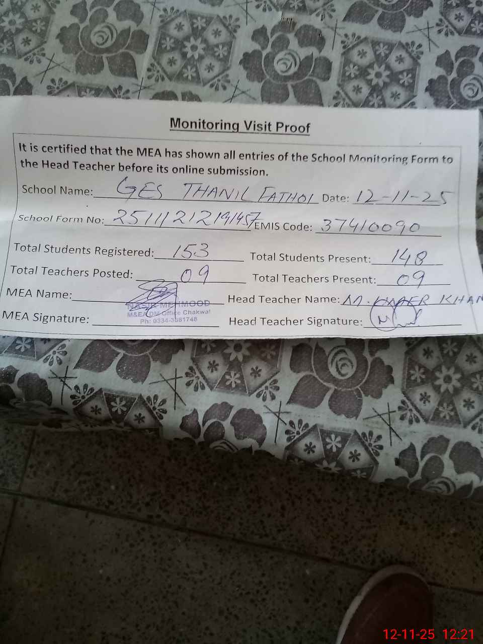 | Attendance Register | Head Teacher | MEA with School | Visit Proof |