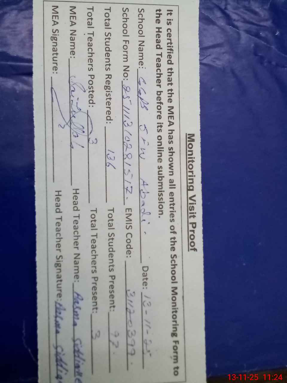 | Attendance Register | Head Teacher | MEA with School | Visit Proof |