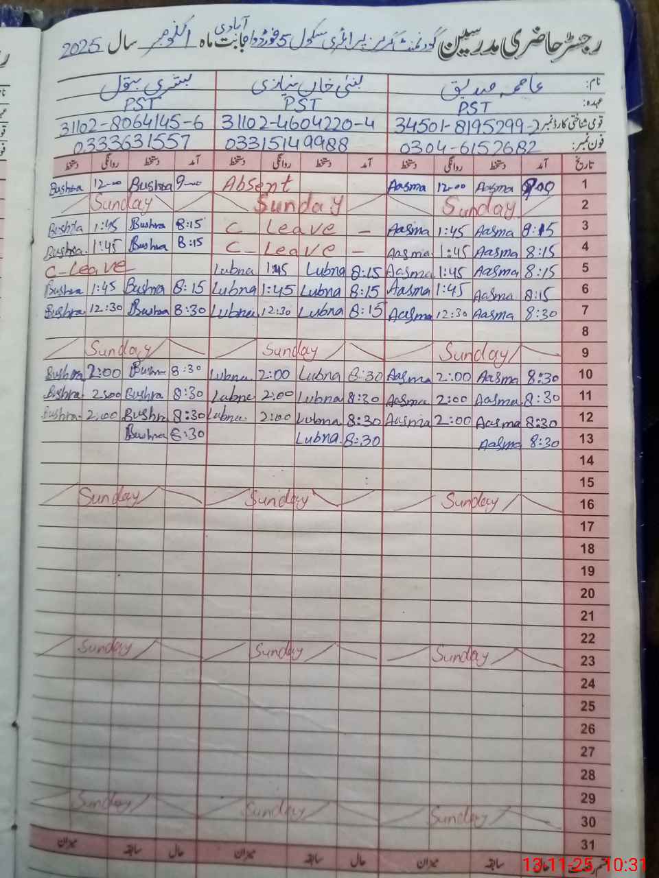 | Name: As**** Si**** Designation: (School Headmaster's/Headmistress's) PST Phone/Cell Number: 03**** |