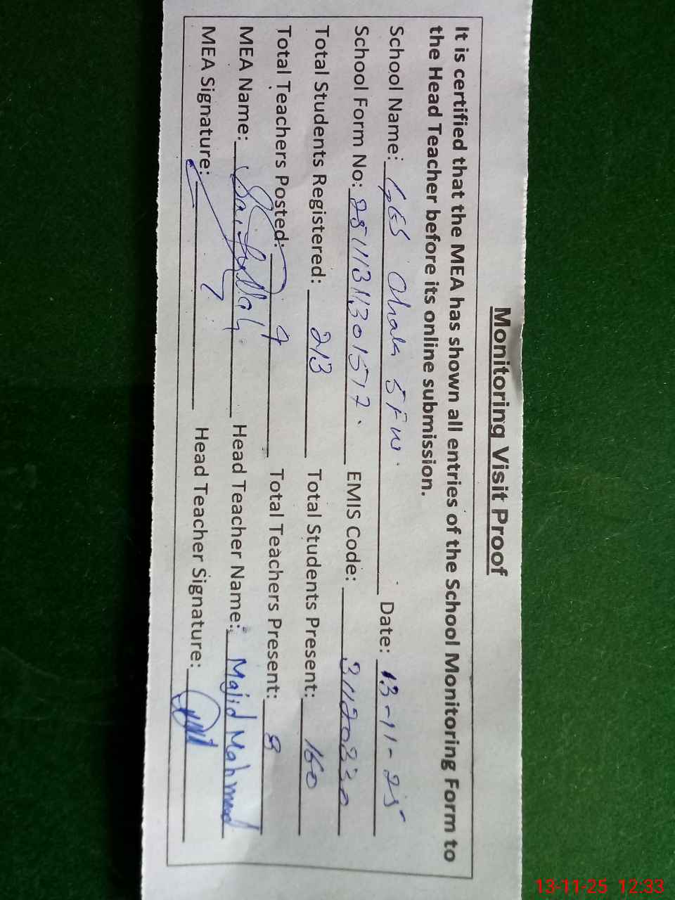 | Attendance Register | Head Teacher | MEA with School | Visit Proof |
