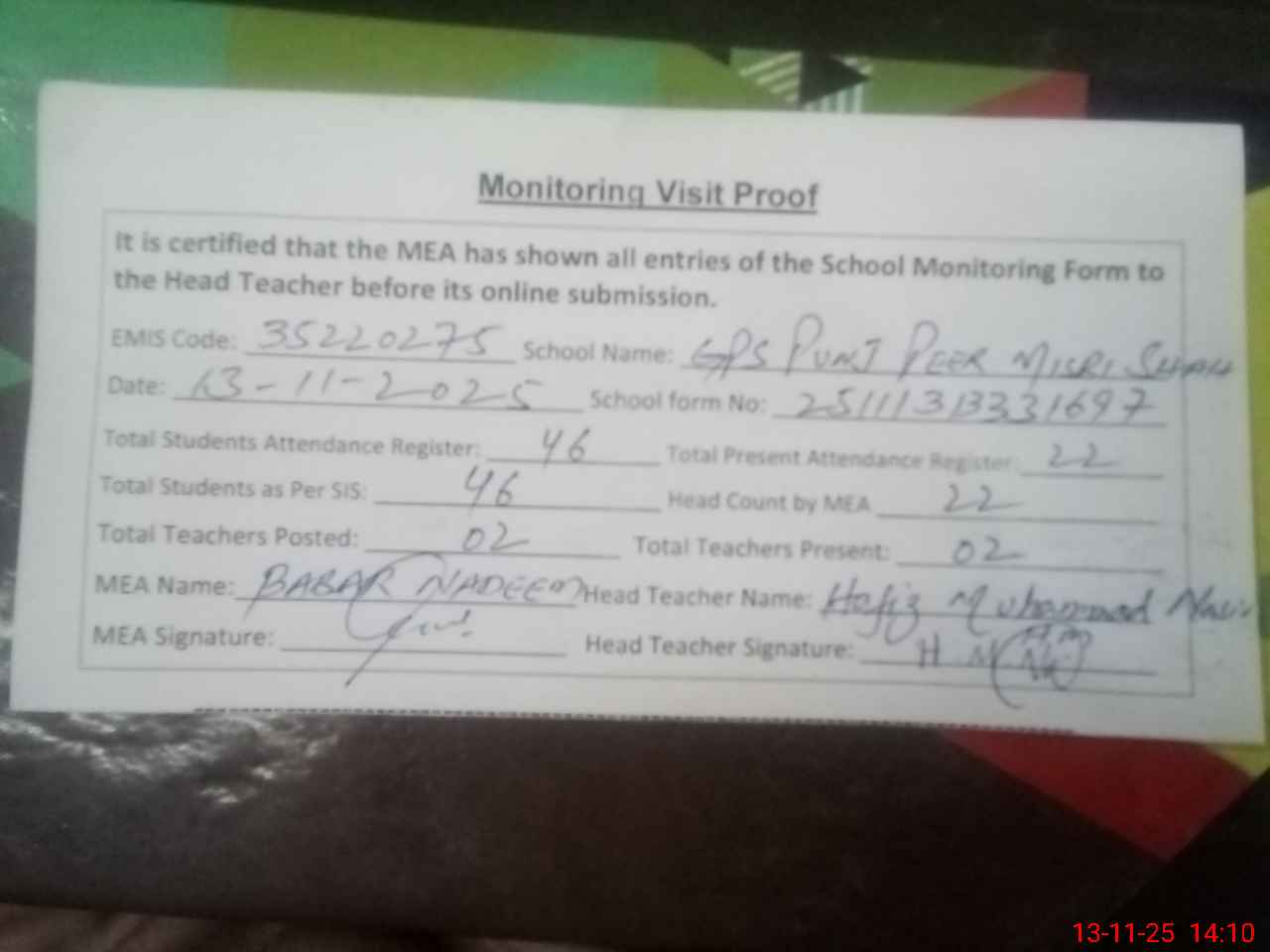 | Attendance Register | Head Teacher | MEA with School | Visit Proof |