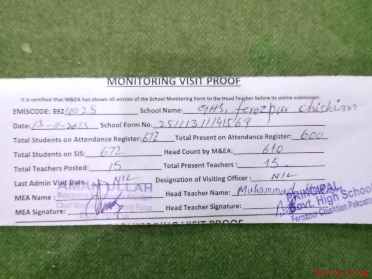 | Attendance Register | Head Teacher | MEA with School | Visit Proof |
