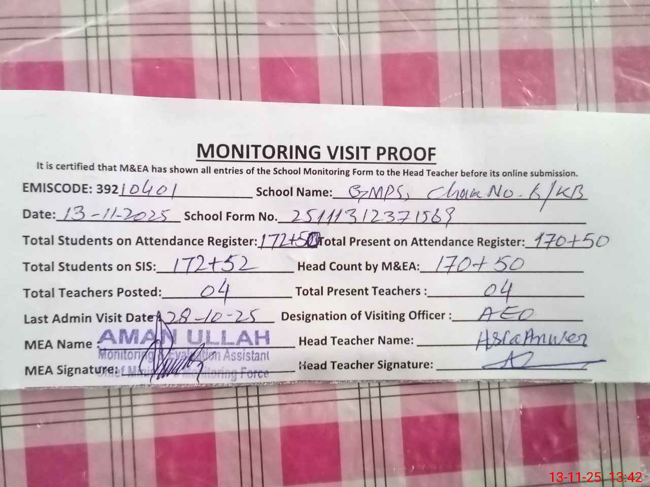 | Attendance Register | Head Teacher | MEA with School | Visit Proof |