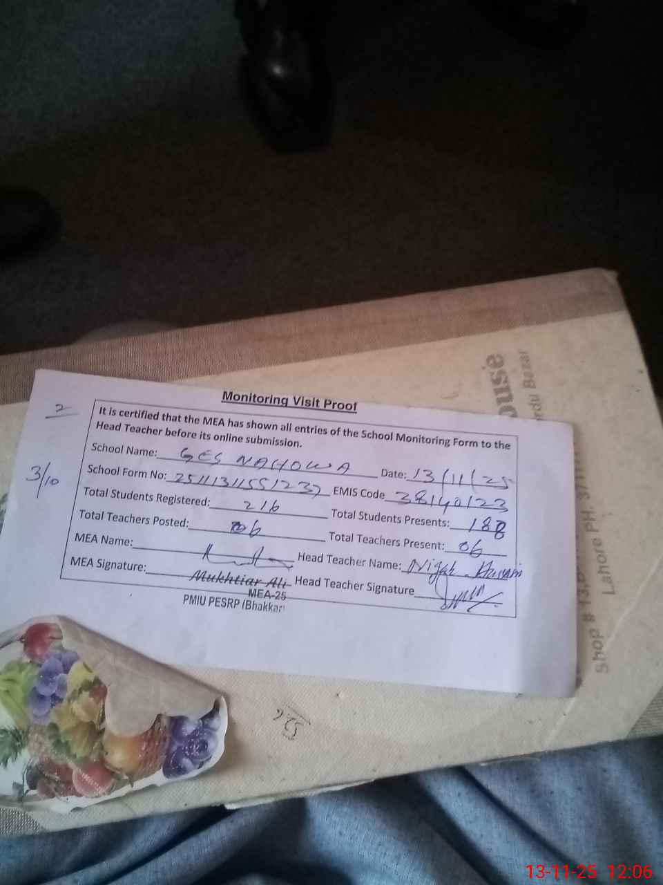 | Remarks (Use Separate Page if Required): Shahzad Fazal Dy DEO 03 October 2025 | |||||