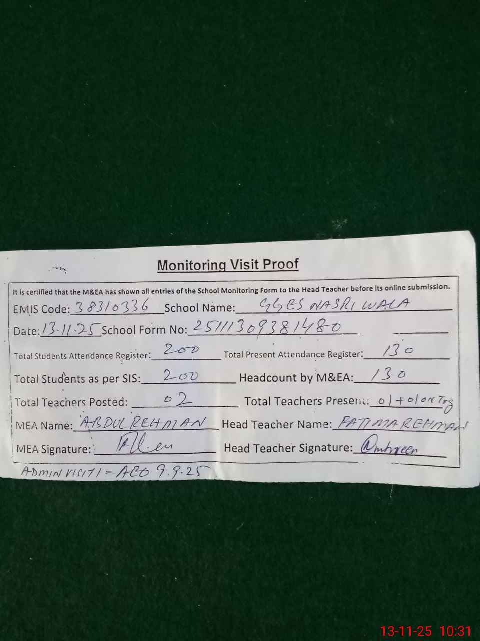 | Attendance Register | Head Teacher | MEA with School | Visit Proof |
