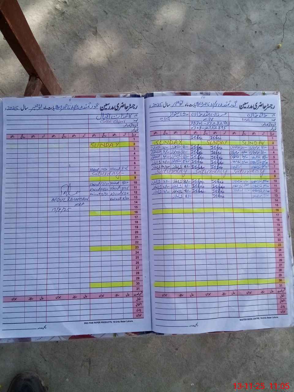 | Total no. of Classrooms: 16 No. of Classrooms Used for Teaching: 12 No. of Classrooms Storing Old Furniture, FTBs, etc: 0Comments if Any: STI Shafqat Khan CNICN 3830189693377 is physically present |