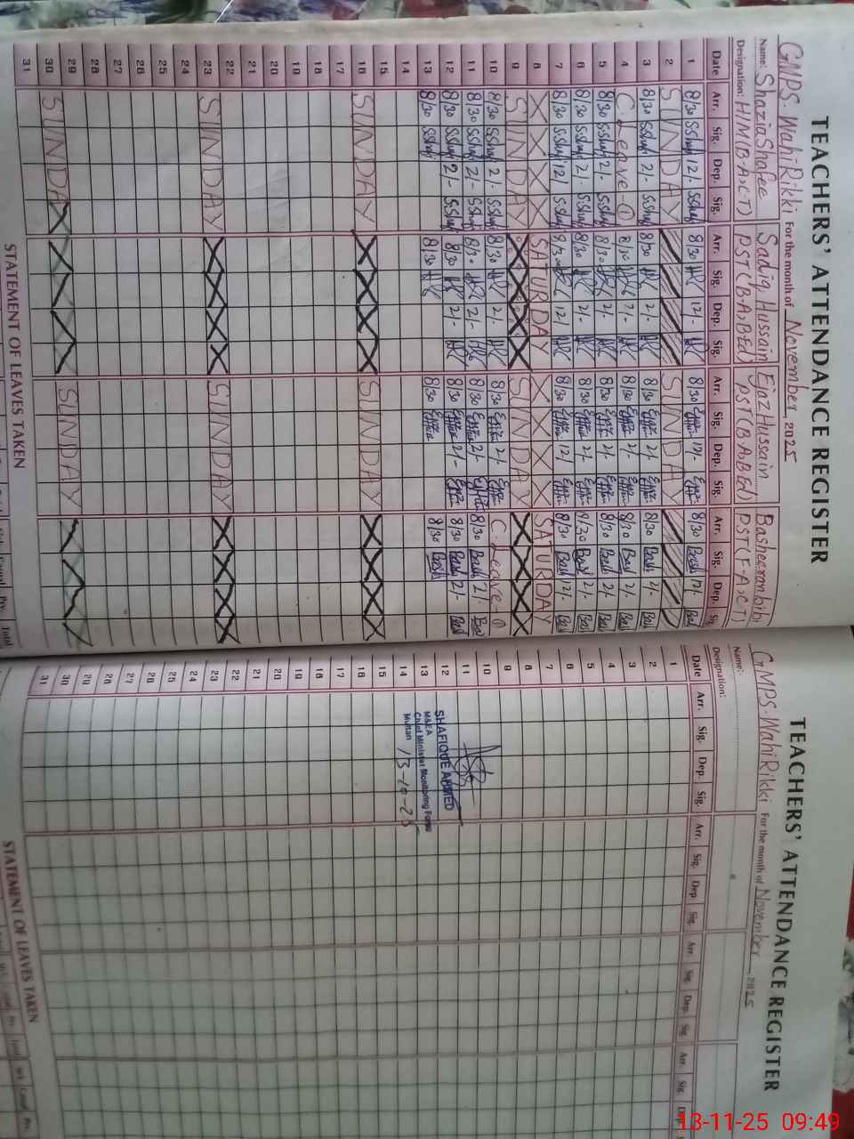 | Remarks (Use Separate Page if Required): PST WAZIRAN SAJID arrived in school at 0934am as per SOPs marked her absent | |||||