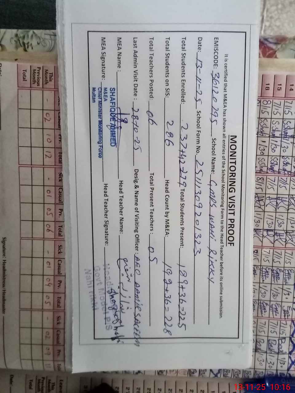| Attendance Register | Head Teacher | MEA with School | Visit Proof |