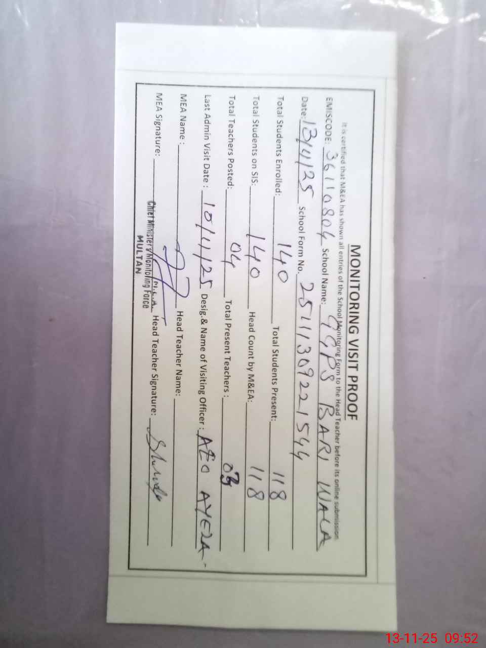 | EMIS Code: 36110804 | Name of School: GGPS BERI WALA TARAF DAIRA | |||