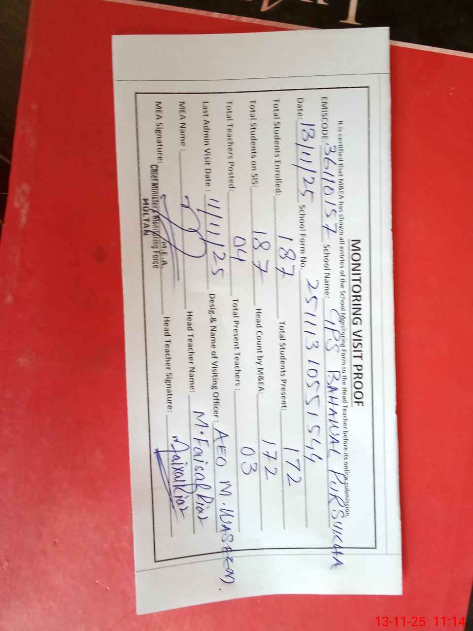 | Attendance Register | Head Teacher | MEA with School | Visit Proof |