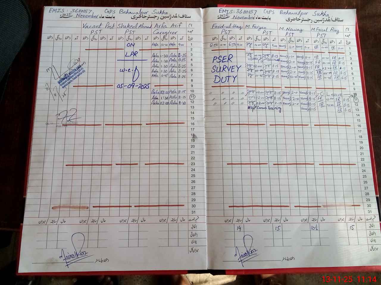 | CNIC | Full Name | Designation | R/C | Absence During Last Calender Month |