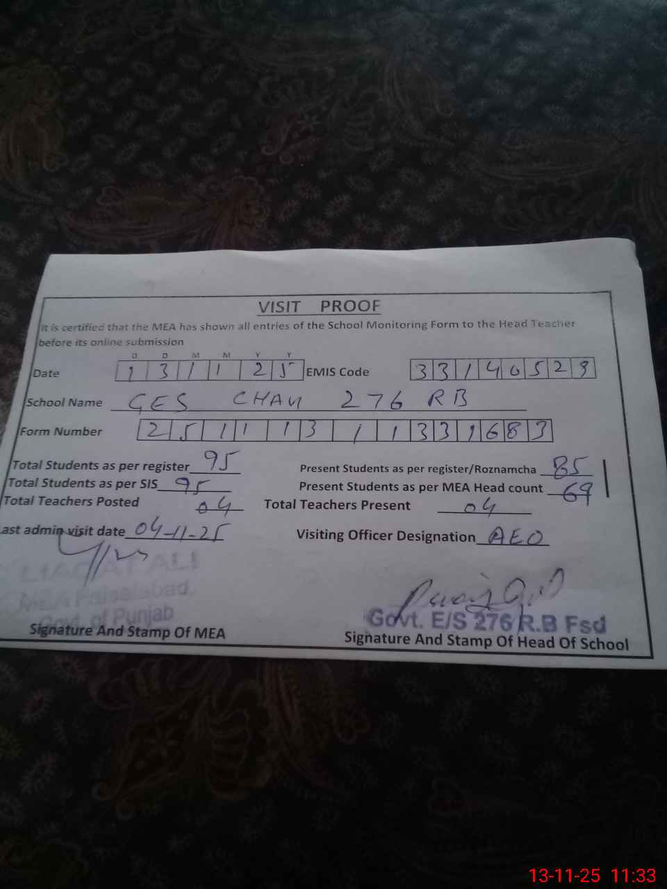 | Attendance Register | Head Teacher | MEA with School | Visit Proof |