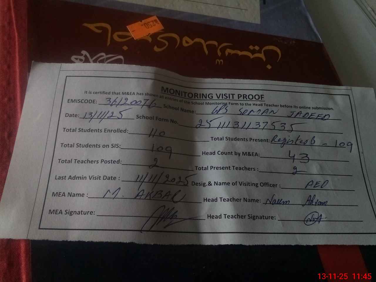 | Attendance Register | Head Teacher | MEA with School | Visit Proof |
