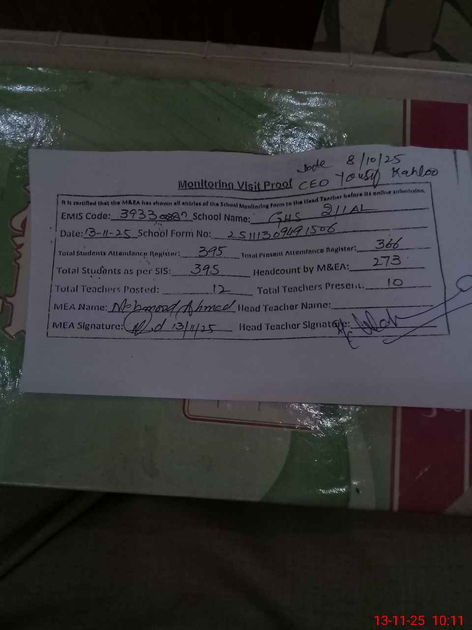 | Attendance Register | Head Teacher | MEA with School | Visit Proof |