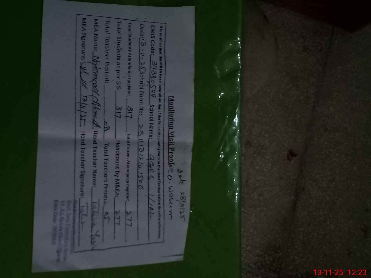 | Attendance Register | Head Teacher | MEA with School | Visit Proof |