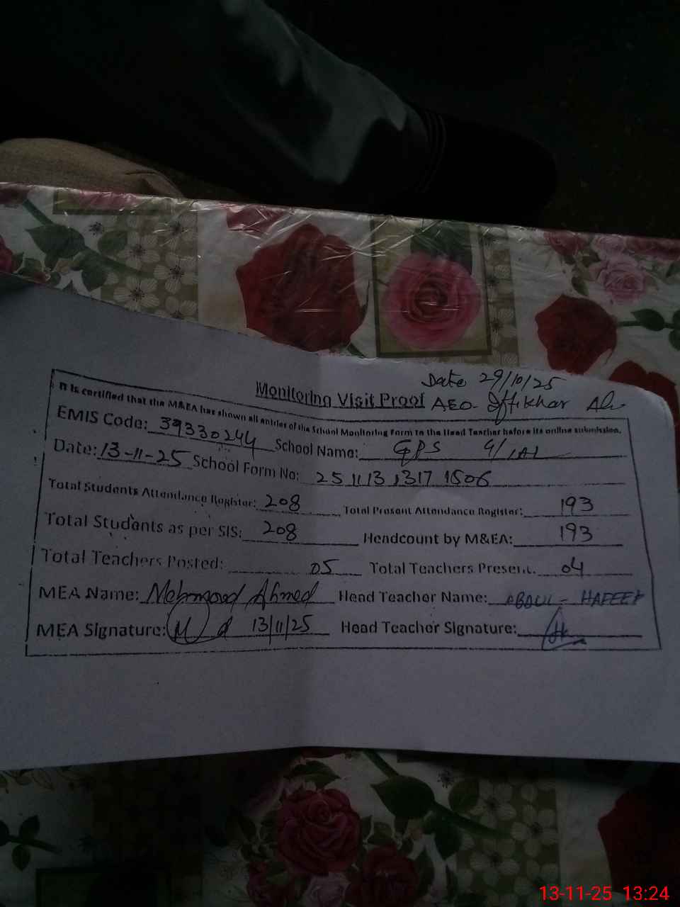 | EMIS Code: 39330244 | Name of School: GPS CHAK 4/1-AL KALAN | |||