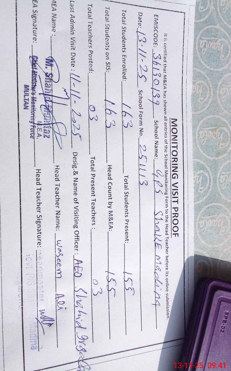 | EMIS Code: 36130139 | Name of School: GPS SHAKH-E-MADDINA MULTAN P/O JHARIAN WALA MULTAN | |||