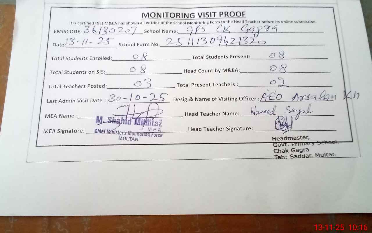 | EMIS Code: 36130207 | Name of School: GPS CHAK GAGRA P/O JHOK VAINCE MOZA CHAK GAGRA MULTAN | |||