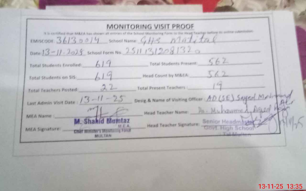 | EMIS Code: 36130014 | Name of School: GHS MATTI TAL P/O JAL WALA MULTAN | |||