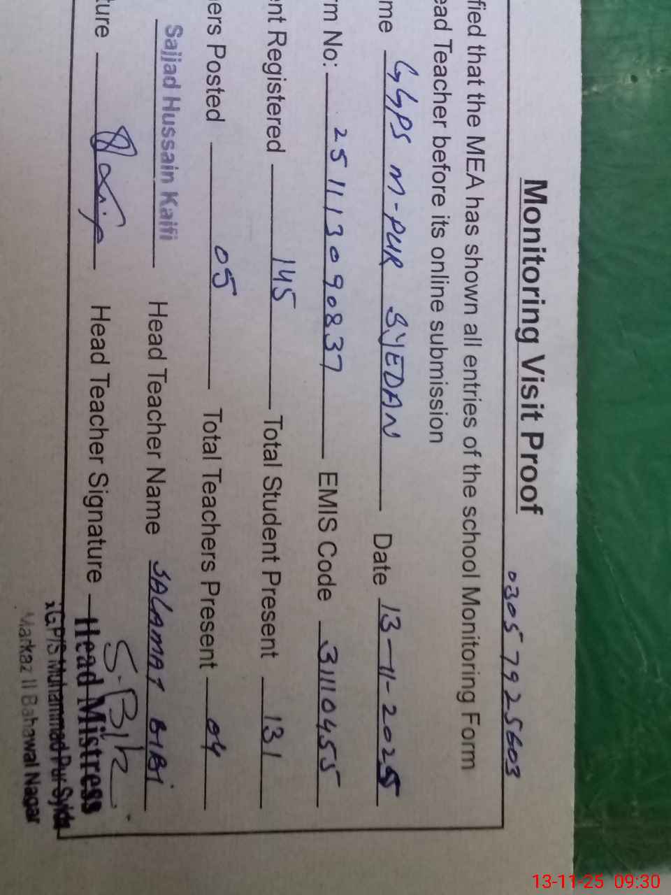| EMIS Code: 31110455 | Name of School: GGPS MUHAMMAD PUR SYEDAN | |||
