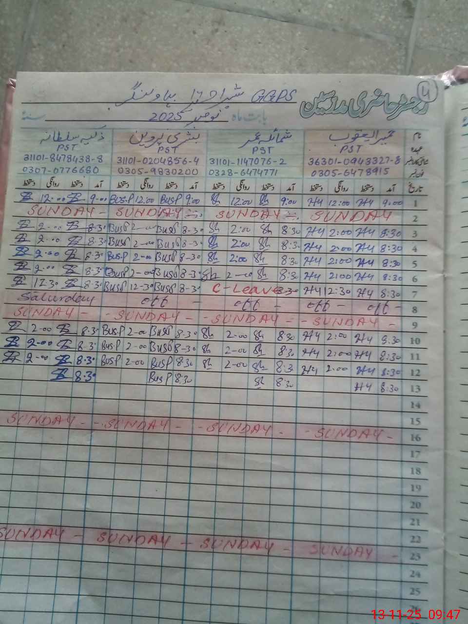 | CNIC | Full Name | Designation | R/C | Absence During Last Calender Month |