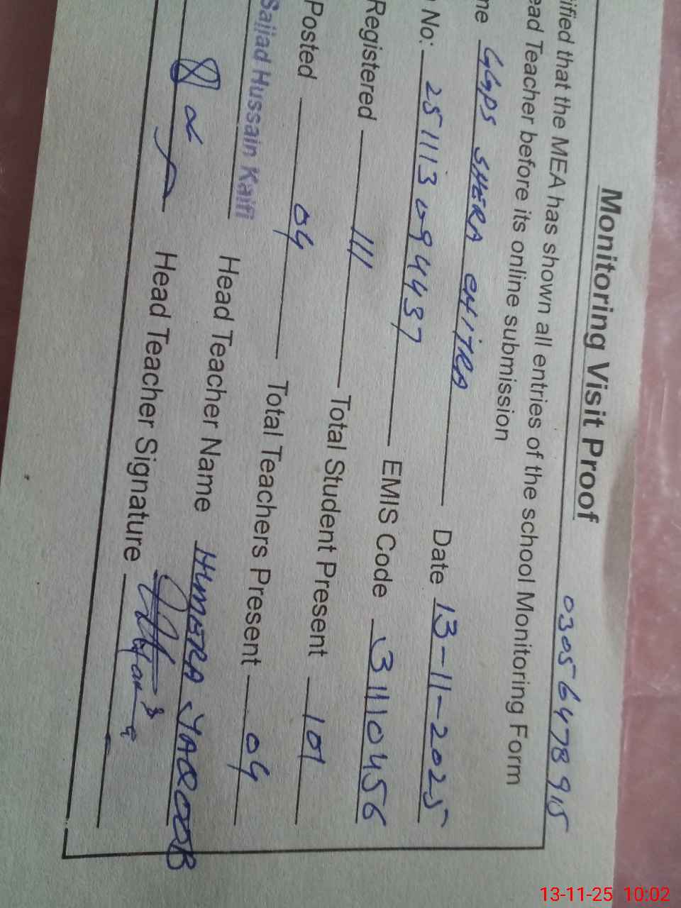 | Attendance Register | Head Teacher | MEA with School | Visit Proof |