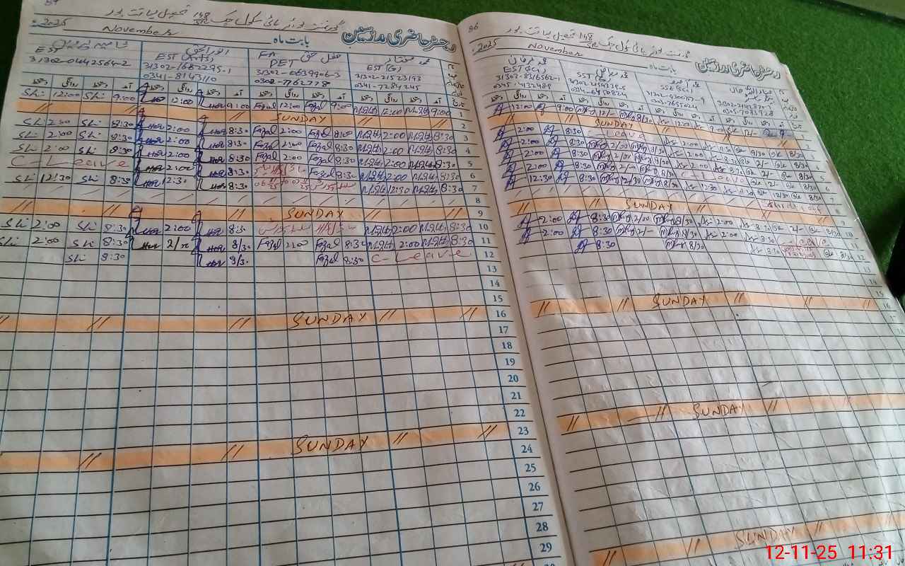 | CNIC | Full Name | Designation | R/C | Absence During Last Calender Month |
