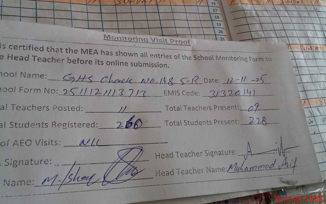 | Attendance Register | Head Teacher | MEA with School | Visit Proof |