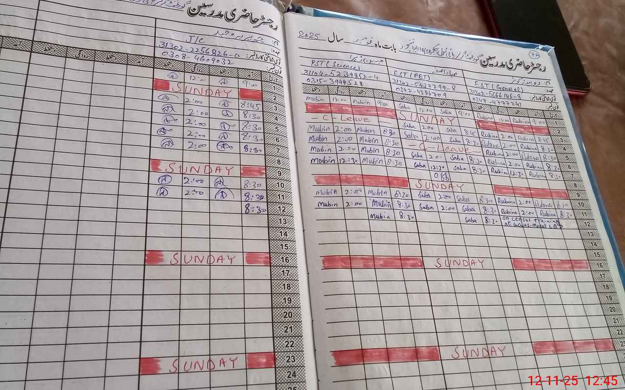 | CNIC | Full Name | Designation | R/C | Absence During Last Calender Month |
