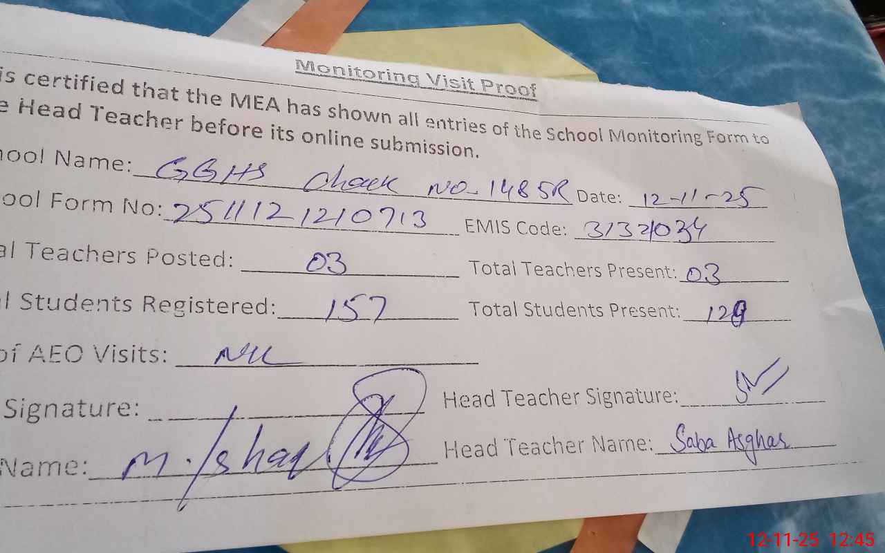 | Attendance Register | Head Teacher | MEA with School | Visit Proof |