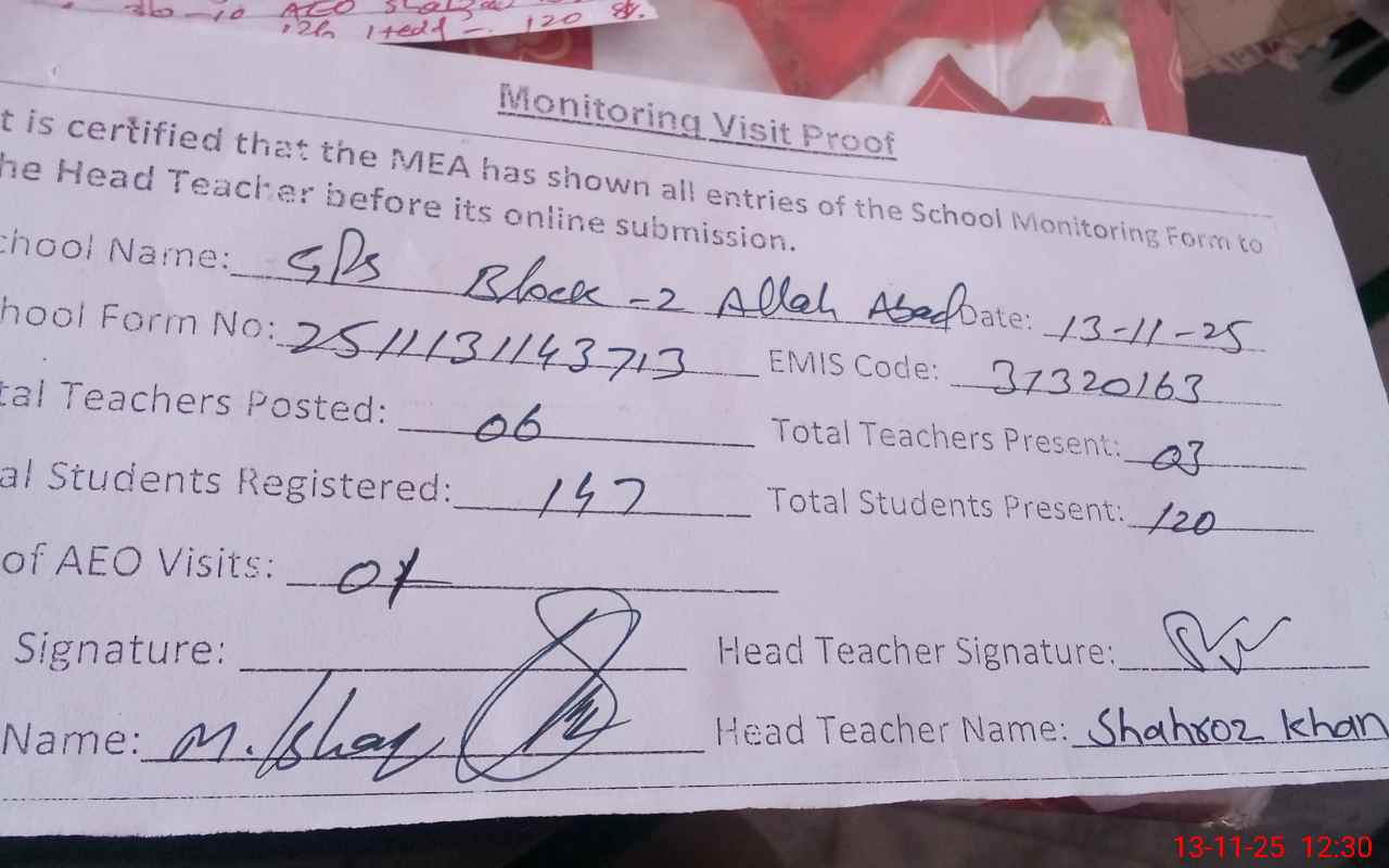 | EMIS Code: 31320163 | Name of School: GPS ALLAH ABAD BLOCK NO 2 | |||