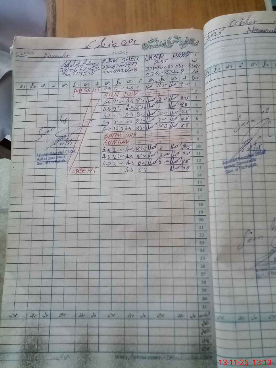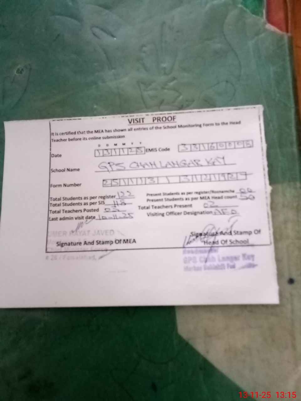 | Remarks (Use Separate Page if Required): 03 TOILETS FOUND NON FUNCTIONAL AT THE TIME OF VISIT DUE TO FLUSHING WATER WAS NOT AVAILABLE FRESH TIME TABLE WAS NOT AVAILABLE IN THE SCHOOL AS NEW TIMING NSB FTF RECORD AND CASH BOOK WAS NOT COMPLETED AFTER MAY 2025 TEACHER ABDUL AZIZ ESE WAS FOUND ABSENT FROM SCHOOL FROM 30 TH APRIL 2025 STUDENTS ATTENDANCE REGISTERS WERE NOT MAINTAINED FROM 1ST NOVEMBER 2025 | |||||