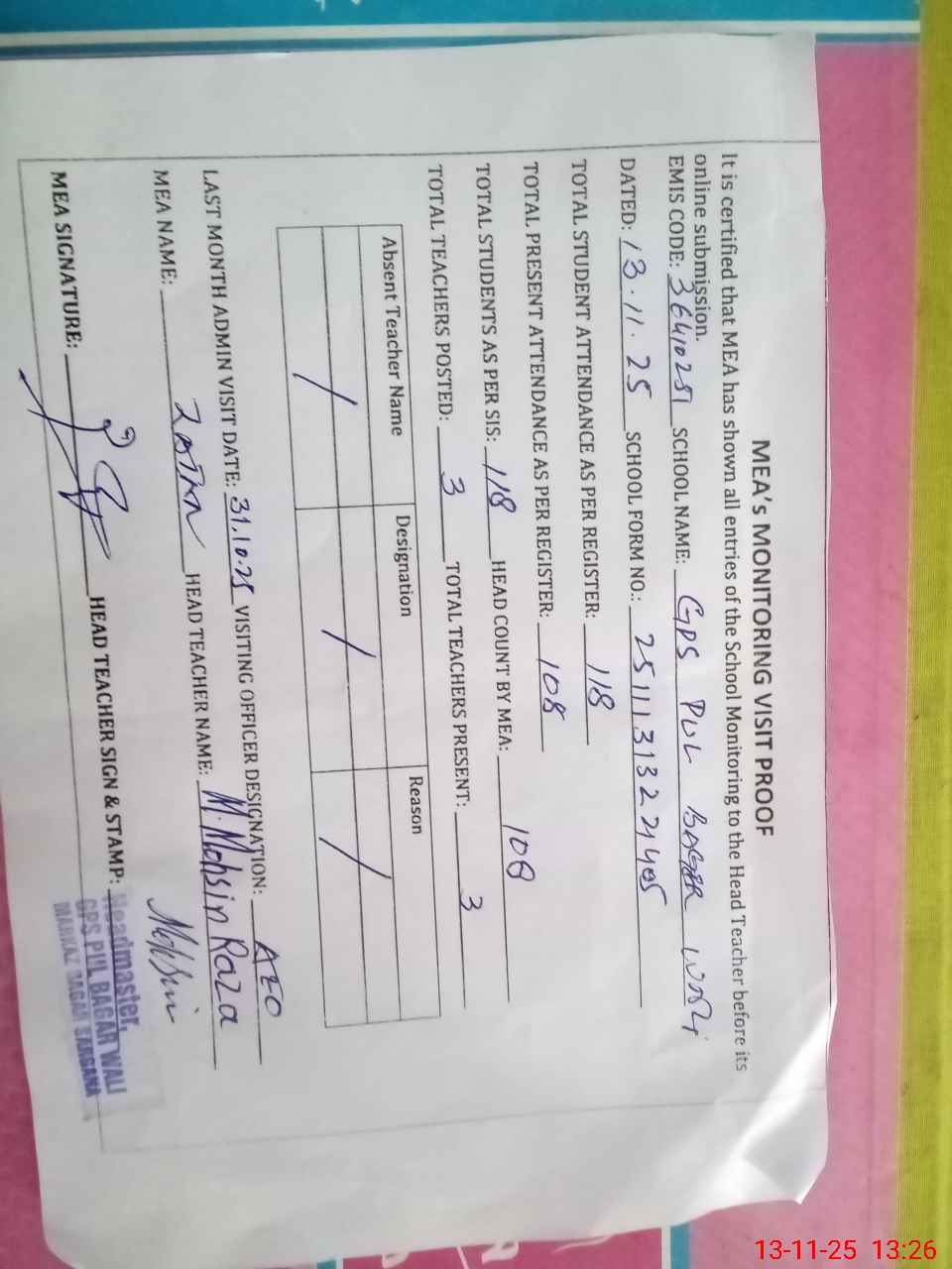 | Attendance Register | Head Teacher | MEA with School | Visit Proof |