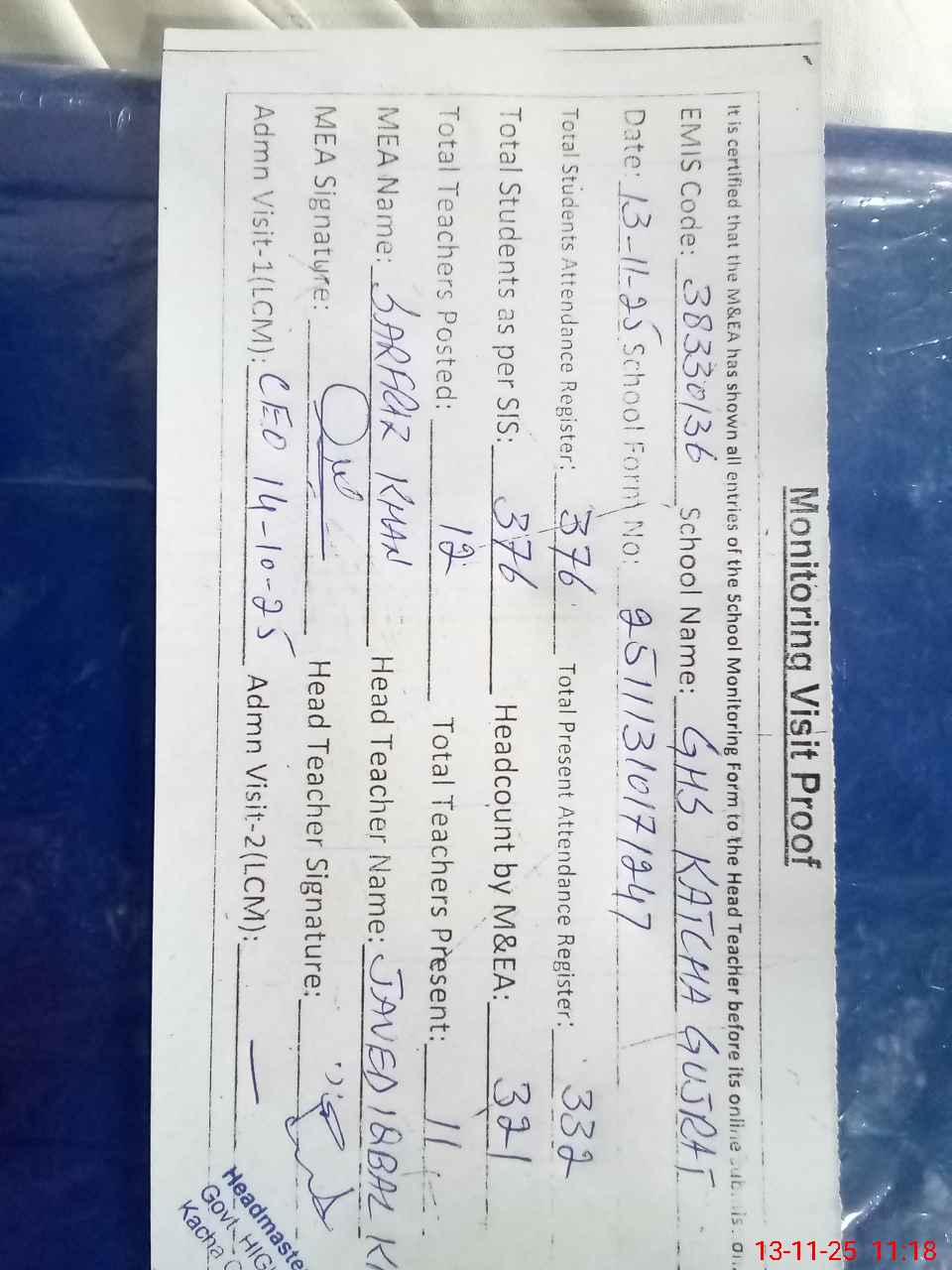 | Attendance Register | Head Teacher | MEA with School | Visit Proof |