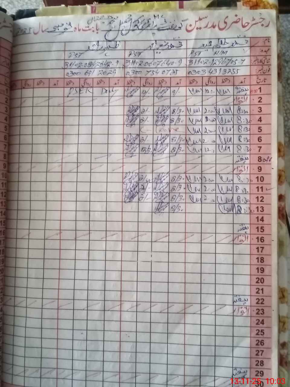 | CNIC | Full Name | Designation | R/C | Absence During Last Calender Month |