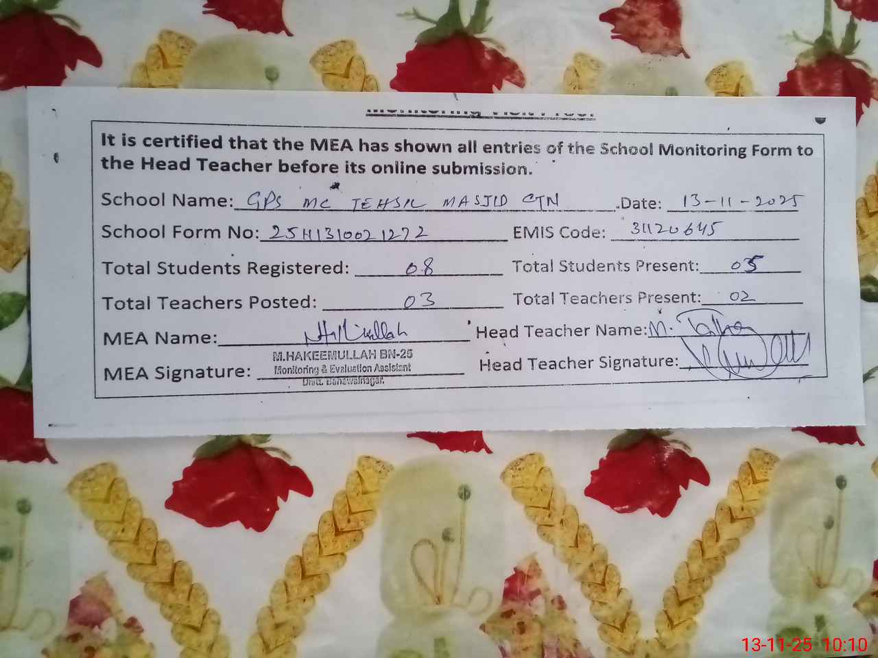 | Attendance Register | Head Teacher | MEA with School | Visit Proof |